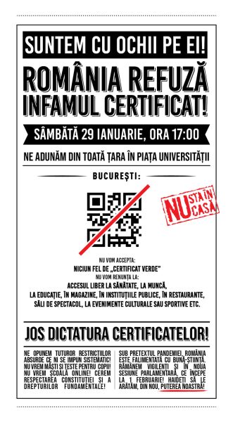 Grupul civic Starea de Libertate și partenerii acestuia anunță un protest împotriva certificatelor covid și a vaccinării copiilor. Manifestația va avea loc sâmbătă, 29 ianuarie, la Piața Universității, începând de la ora 17:00. În pregătirea mitingului, Starea de Libertate a sprijinit grupul NOI în afișarea mesajului „STOP CERTIFICAT” pe blocul de lângă Academia Oamenilor de Știință din România.