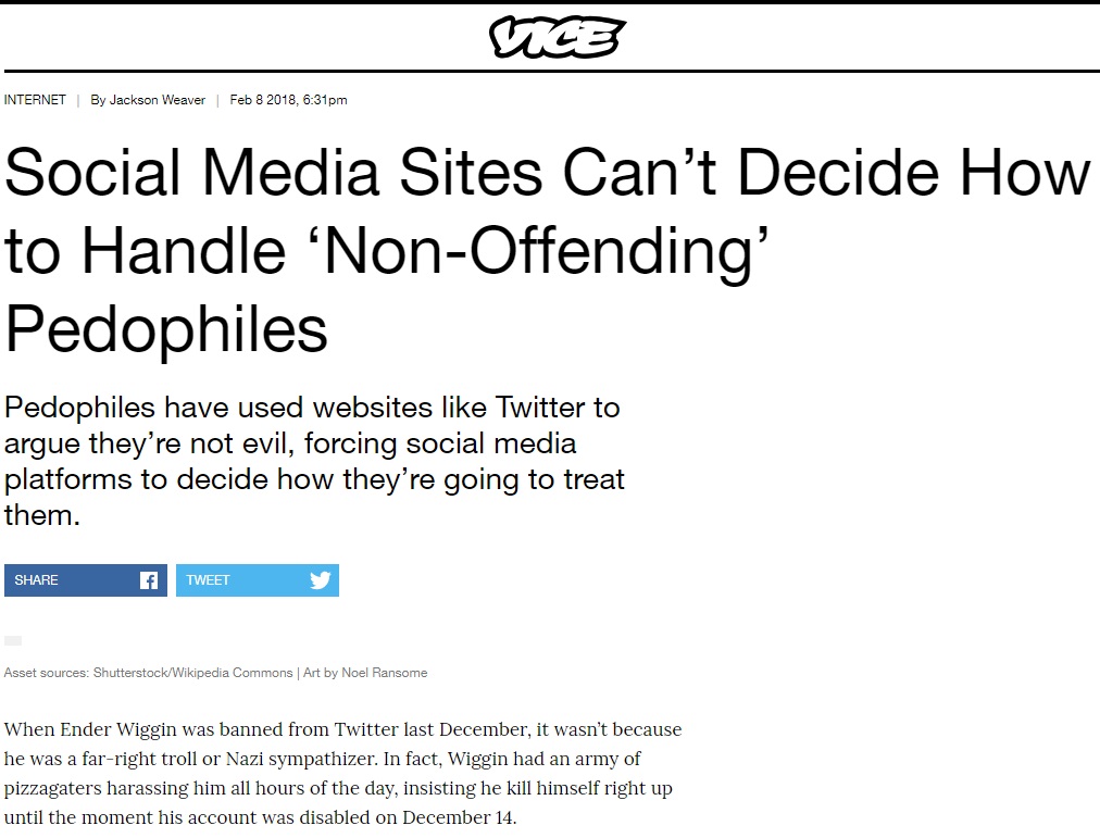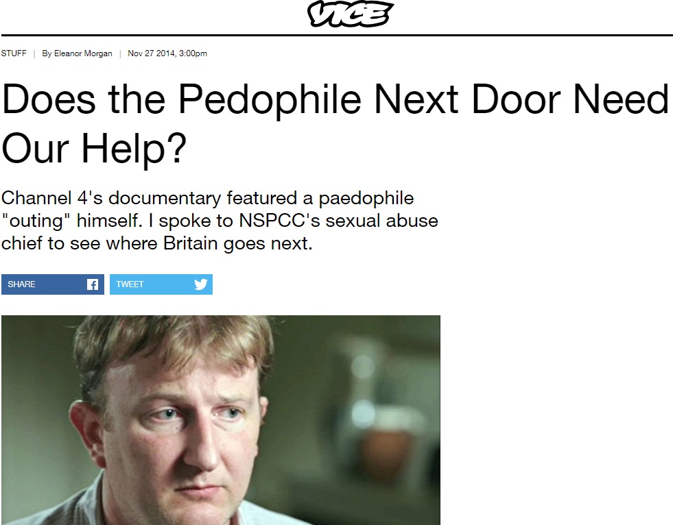 Se merge atât de departe încât Vice tocmai a publicat un articol scris de un pedofil, care se află în pușcărie pentru că a abuzat minori, pe care i-a fotografiat în ipostaze erotice, i-a obligat să se uite la filme porno, și așa mai departe.