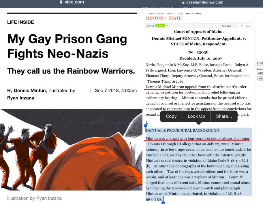 Articolul începe cu Mintun povestind că este gay și închis pentru o crimă sexuală, niciunde nu se specifică faptul că este pedofil și că a abuzat minori, decât undeva pe la finalul articolului, după o propagandă ieftină despre cum neo-naziștii din pușcărie îl foloseau pe post de *femeie* și cum a reușit să îi învingă.