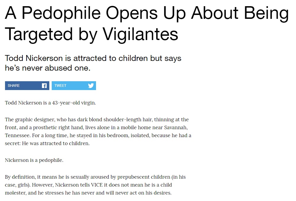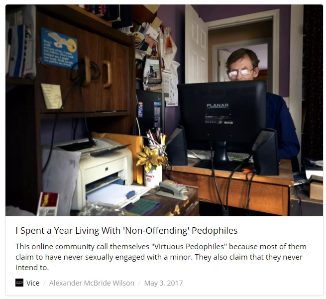 Apoi ne prezintă povestea unui pedofil, care deși este atras de copii, nu i-a abuzat niciodată, însă el a fost abuzat de oameni când au aflat că este pedofil… (articolul Vice aici).