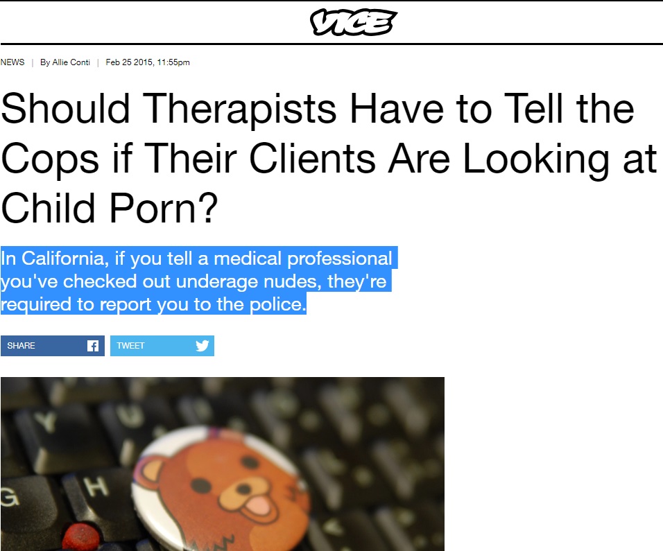 Vice se întreabă dacă este corect ca terapeuții să fie obligați să anunțe poliția dacă pacientul lor se uită la poze cu minori…