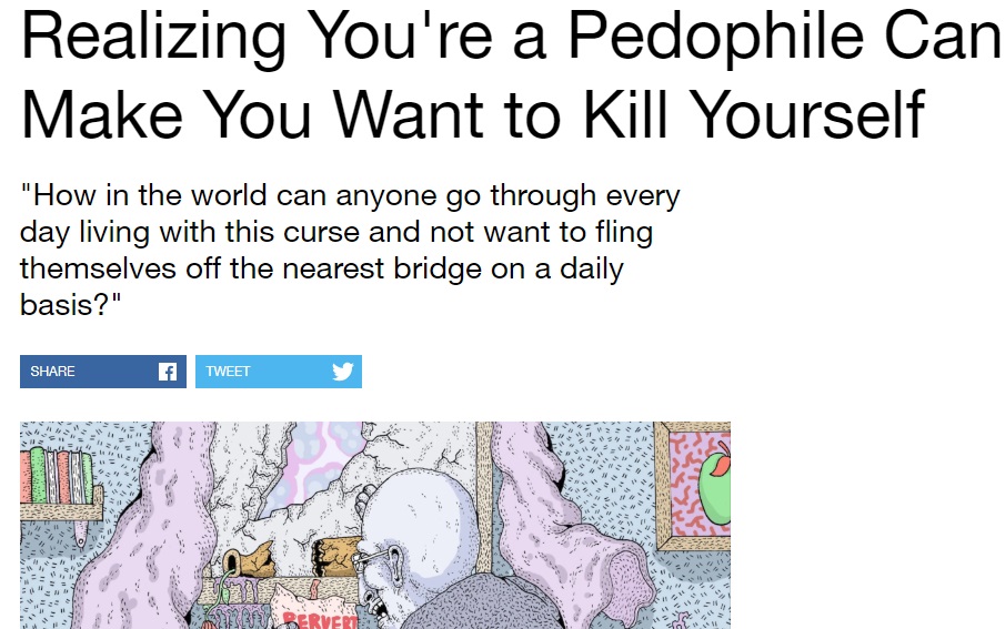 Alt articol marca Vice încearcă să ne sensibilizeze și mai tare. *Realizând că ești pedofil, poate să te facă să vrei să te sinucizi* se intitulează și se poate citi aici.