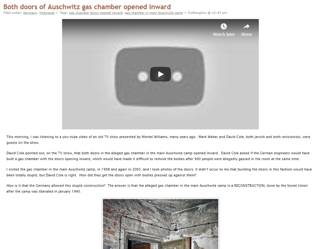 Repet pentru a șase milioana oară: nimeni nu neagă că evreii au fost puși în lagăre. Nimeni nu neagă că mulți oameni au murit în aceste lagăre, cauza principală fiind febra tifoidă, răspândită de păduchi și purici (de aici și folosirea gazului insecticid Cyclon B, care a fost folosit și în anii ’20 în SUA – cu scopul de a proteja prizonierii de îmbolnăvire, nu de a-i omorî)