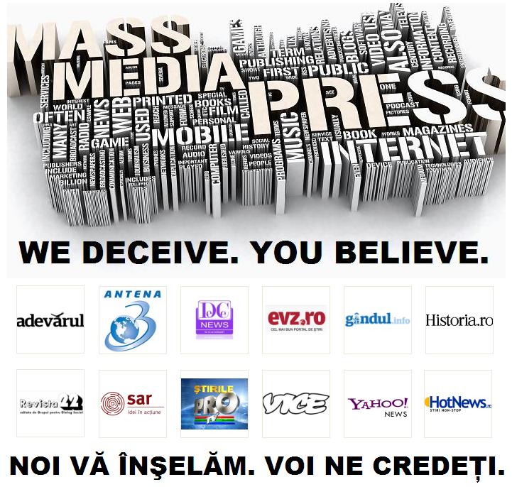 Presa este literalmente vândută politicienilor, Guvernul le-a dat milioane de euro în timpul pandemiei, altfel ar fi falimentară pentru că NU ESTE ONESTĂ și oamenii au început să realizeze asta. Numai pomana guvernamentală mai ține în viață oficinele de presă care denigrează încontinuu România. Câteva exemple ale presei mincinoase din România: G4media, Digi24, Adevarul, Vice, Newsweek, Deutche Welle, DCNews, Revista22, ProTV, RealitateaTV, Historia, Hotnews, etc.