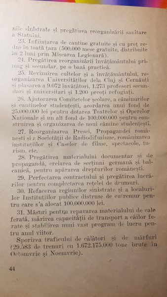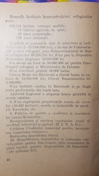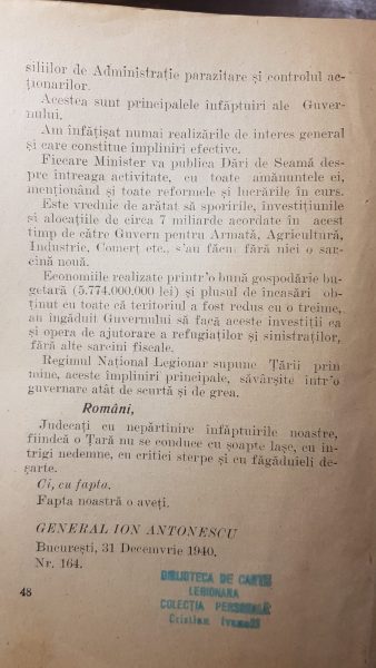 Regimul Național Legionar supune Țării prin mine, aceste împliniri principale, săvârșite intr-o guvernare atât de scurtă și de grea.