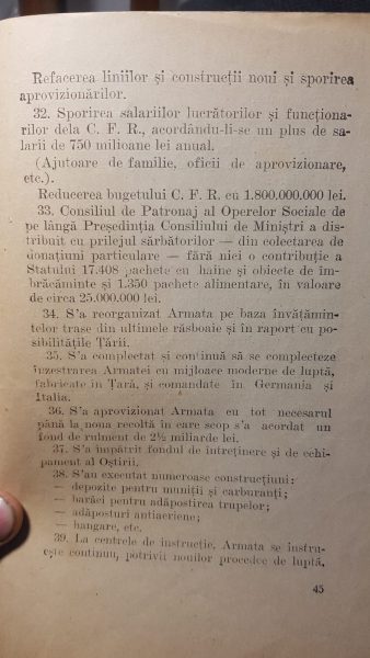 Economiile realizate printr-o bună gospodărie bugetară (5.774.000.000 lei) și plusul de încasări obținute cu toate că teritoriul a fost redus cu o treime, au îngăduit Guvernului să facă aceste investiții ca și opera de ajutorare a refugiaților și sinistraților, fără alte sarcini fiscale.