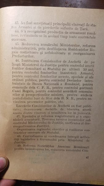 - Instituirea Comisiunilor de Anchetă de pe lângă Ministerul de Justiție pentru controlul averii foștilor demnitari ai Statului pe ultimii 10 ani, pentru controlul fondurilor înzestrării Armatei, ordinei publice, pentru controlul Devizelor întrebuințate de Banca Națională a României, pentru comenzile de la C. F. R., pentru controlul acordării concesiunilor si prospecțiunilor miniere, pentru ancheta portofoliului luat de Stat de la B. N. R., pentru revizuirea proceselor politice, etc.