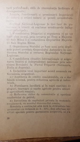 d) Investirea de capitaluri private în economia românească, cu acordul Guvernului român. România a contractat altădată în străinătate împrumuturi cu dobândă de 8-10%, deși afectase venituri speciale pentru garantarea acoperirii, ni s-a impus controlul străin pentru a supraveghea finanațele noastre. Creditele deschise de guvernul german sunt pe 10 ani, cu dobândă minimă, fără nici o măsură de atingere a suveranitâții noastre, fără a afecta fondul bogăției naționale.