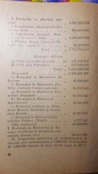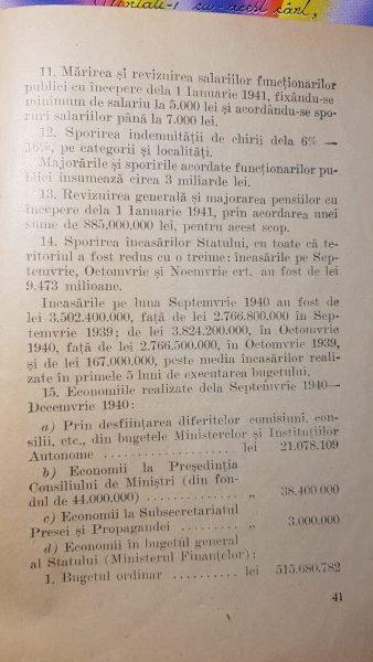 Încasările pe luna Septembrie 1940 au fost de lei 3.502.400.000 față de lei 2.766.500.000, in Octombrie 1939, și de lei 167.000.000, peste media încasărilor realizate În primele 5 luni de executarea bugetului. - Economiile realizate de la Septembrie 1940 – Decembrie 1940;