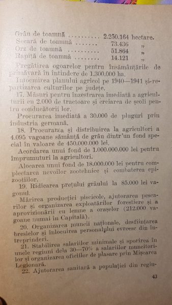 - Stabilirea salariilor minimale și sporirea în unele regiuni de la 30-70% a salariilor muncitorilor si organizarea oficiilor de plasare prin Mișcarea Legionară.