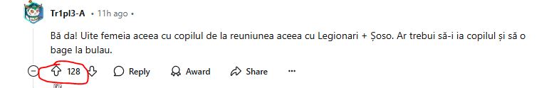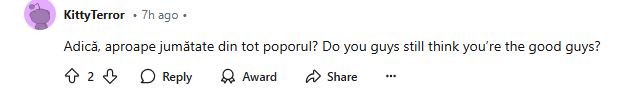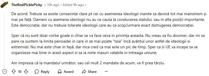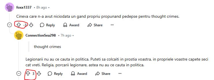 Vedeți în poza de mai jos un exemplu care indică problema de pe Reddit. Avem o postare în care cineva atrage atenția că nu e bine să se ceară arestarea oamenilor pentru opiniile lor, fiind echivalentul delictului de opinie sau de gândire. Postarea a primit jos-voturi. Avem apoi altă postare agresivă și vulgara în care se insistă pe ideea că cei ce au anumite opinii politice (simpatii legionare în cazul acesta) nu au ce căuta în politică. Postarea a primit sus-voturi.