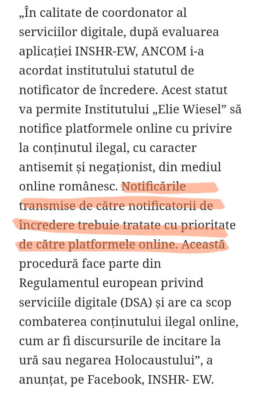 „În calitate de coordonator al serviciilor digitale, după evaluarea aplicației INSHR-EW, ANCOM i-a acordat institutului statutul de notificator de încredere. Acest statut va permite Institutului „Elie Wiesel” să notifice platformele online cu privire la conținutul ilegal, cu caracter antisemit și negaționist, din mediul online românesc. Notificările transmise de către notificatorii de încredere trebuie tratate cu prioritate de către platformele online. Această procedură face parte din Regulamentul european privind serviciile digitale (DSA) și are ca scop combaterea conținutului ilegal online, cum ar fi discursurile de incitare la ură sau negarea Holocaustului”, a anunțat, pe Facebook, INSHR- EW.