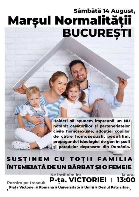 Manifestarea este autorizată de Primăria Capitalei (încă din luna iunie!) și vă așteptăm sâmbătă 14 august la ora 13:00 în Piața Victoriei pe toți aceia care doriți să trăiți și să vă creșteți copiii într-o țară normală. Din Piața Victoriei vom porni pe traseul Piața Romană – Piața Universității – Piața Unirii – Patriarhia Română.