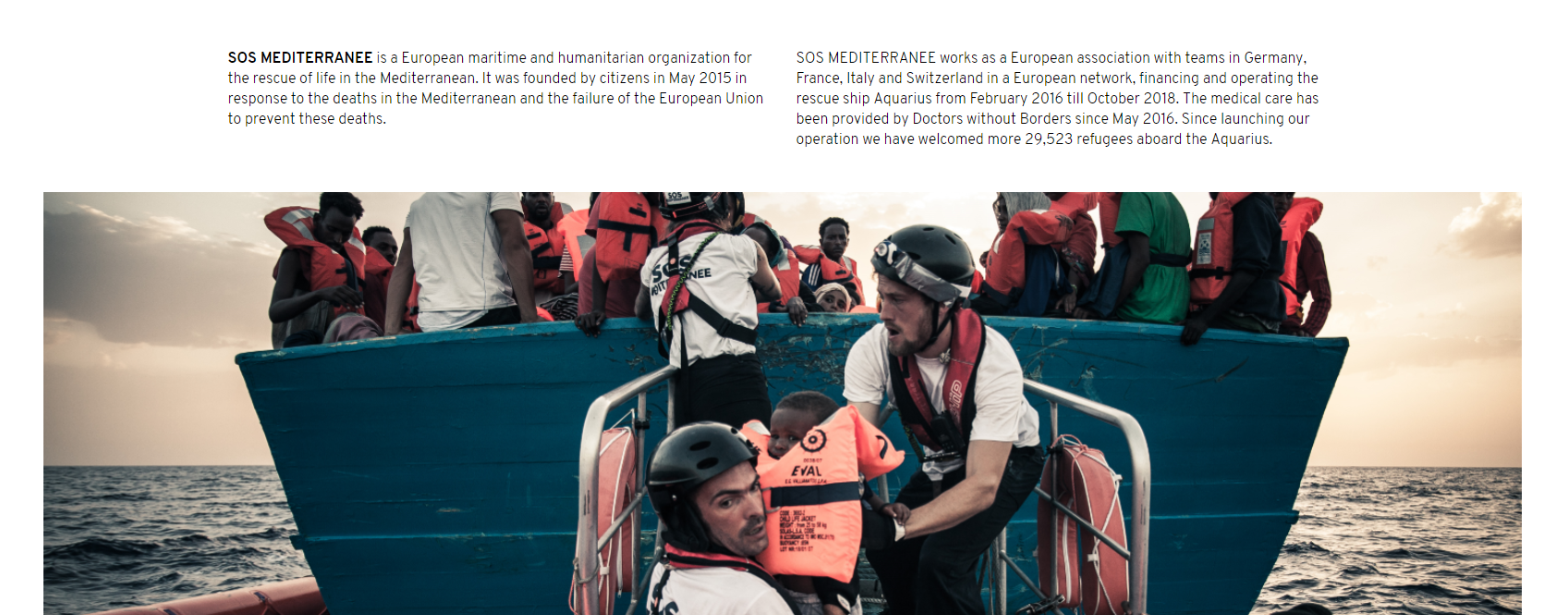 De pe pagina SOS Méditerranée aflăm că ei sunt o organizație umanitară fondată în mai 2015 ca răspuns la refugiații morți în Marea Mediterană și la eșecul U.E. de a preveni aceste morți.