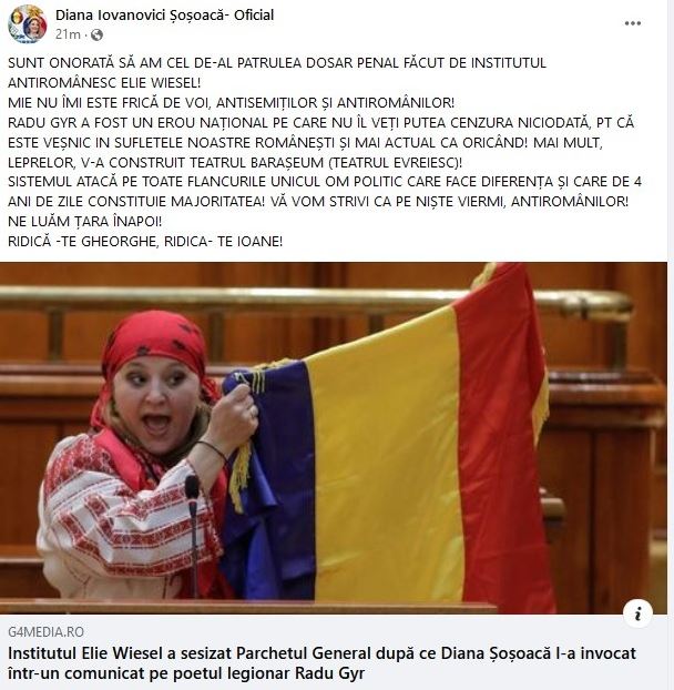 În urma comunicatului public în care a inclus versurile poetului Radu Gyr, senatoarea Diana Șoșoacă s-a ales cu o sesizare făcută de institutul antiromânesc Elie Wiesel la Parchetul General.