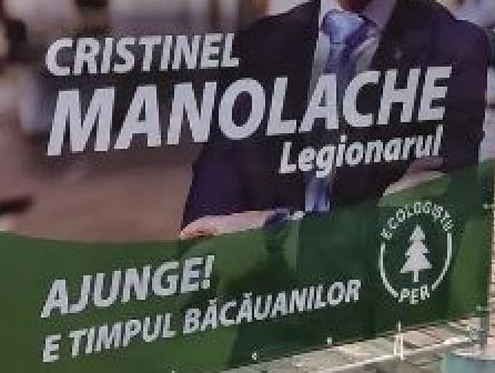 Sloganul cripto-extremist “AJUNGE! E timpul băcăuanilor“, conceput în laboratoarele propagandiștilor antisemiți, apare pe fundalul culorii verde, de nuanță legionară, partidul ‘ecologist’ fiind un pretext convenabil care să acopere o conspirație pentru răsturnarea democrației.