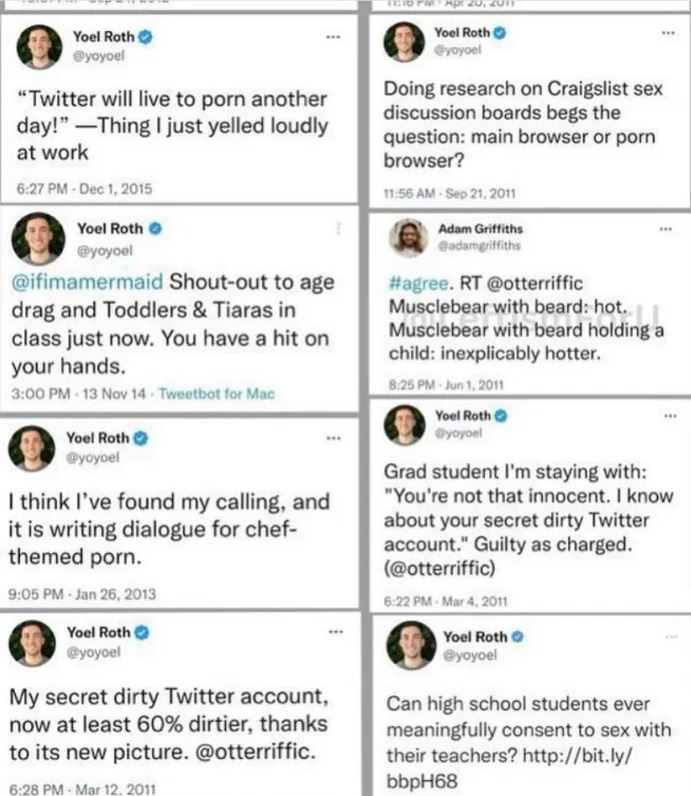 Teza doctorat susține ideea că micuții ar trebui să fie lăsați să acceseze aplicația de matrimoniale pentru homosexuali Grindr, deși nu este pentru minori. Nu doar atât, dar Roth posta aluzii deschise la pedofilie pe una dintre paginile sale de Twitter.