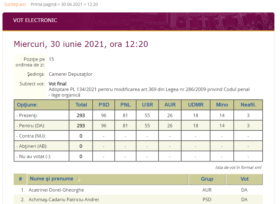 Din 293 de deputați prezenți la vot, 293 au votat DA, inclusiv cei 29 de deputați de la A.U.R.