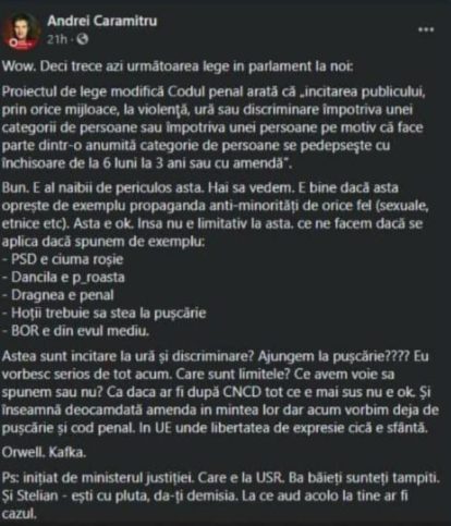 Stimați colegi de la R3media, este un lucru bun că nu s-au dat condamnări pe legea din 2009. De ce au modificat-o acum, pentru ca să fie mai ușor să se dea condamnări sau care este raționamentul? În orice caz, pentru un partid care vorbește de Libertate ca un pilon, știți pe cineva (din A.U.R.) care să îi fi luat apărarea lui Florin Dobrescu după ce i s-a deschis dosar penal pentru comemorarea de la Tâncăbești? Știți pe cineva (din A.U.R.) care să fi scos un cuvințel despre cazul domnului colonel Vasile Zărnescu, condamnat la închisoare cu amânare pentru publicarea unor studii despre holocaust? Cine din A.U.R. a vorbit împotriva conceptului de “instigare la ură” ca fiind o măciucă de intimidare a celor care-și permit să spună lucruri incomode? Iar referitor la argumentul “nu este o nouă lege, ci legea din 2009”, asta s-a întâmplat și când s-a publicat legea 217/2015, teoretic nu era o lege nouă, ci o completare la OUG 31/2002.