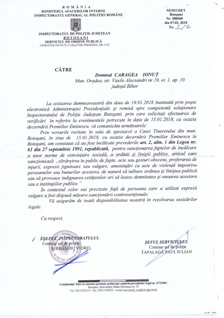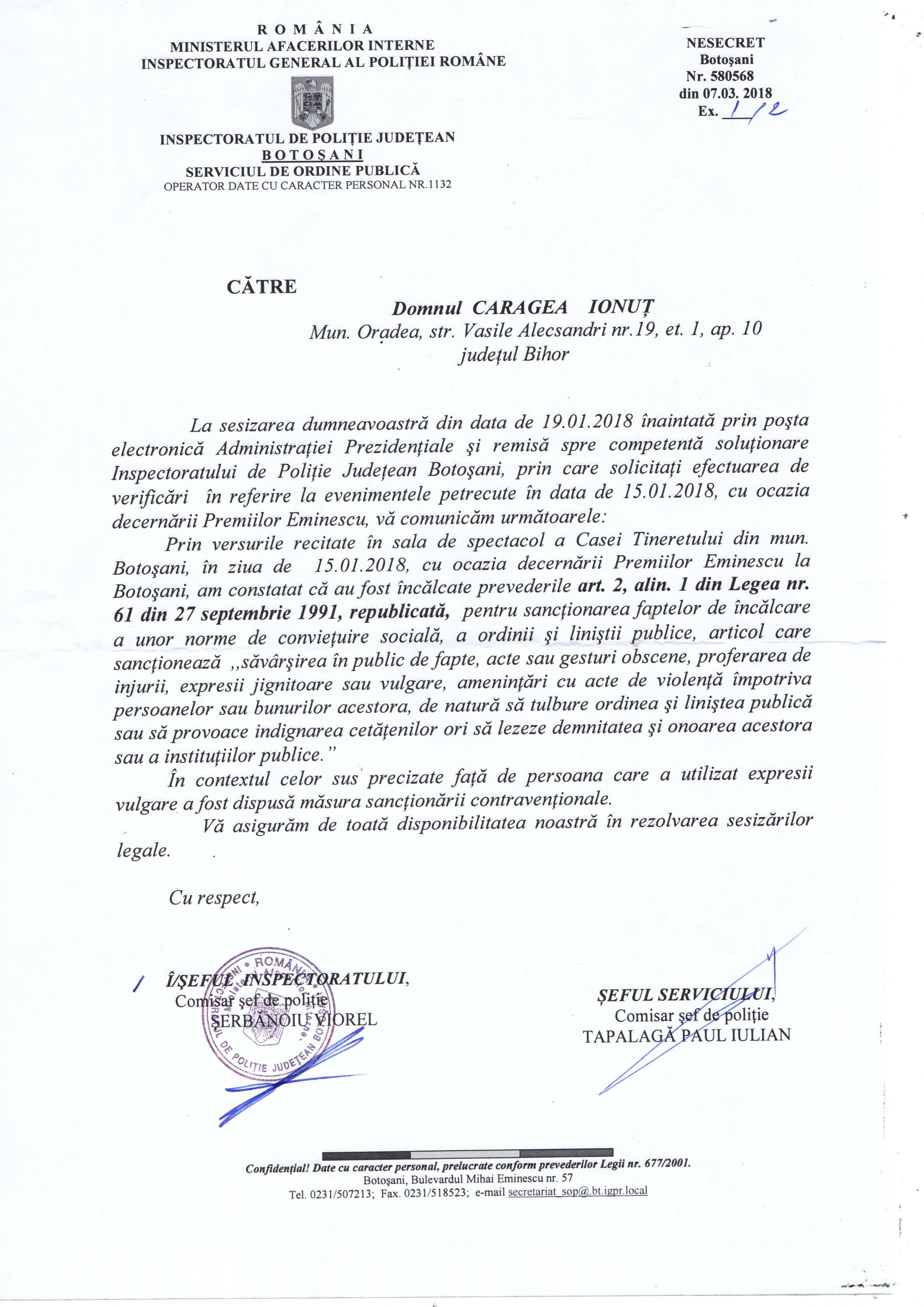 Domnul Ionuț Caragea mi-a trimis un email care conține răspunsul Inspectoratului Județean de Poliție Botoșani la sesizarea sa împotriva degeneratei.