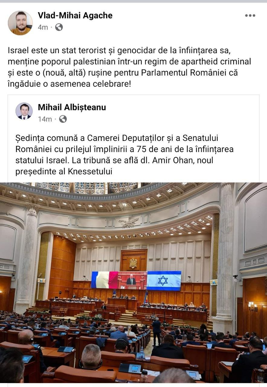 “Muţenia parlamentarilor noştri cu privire la caracterul terorist al politicii israeliene, la genocidul continuu şi la crimele împotriva umanităţii la care sunt supuşi palestinienii reprezintă (încă) o ruşine pentru Parlamentul României.” – Vlad-Mihai Agache
