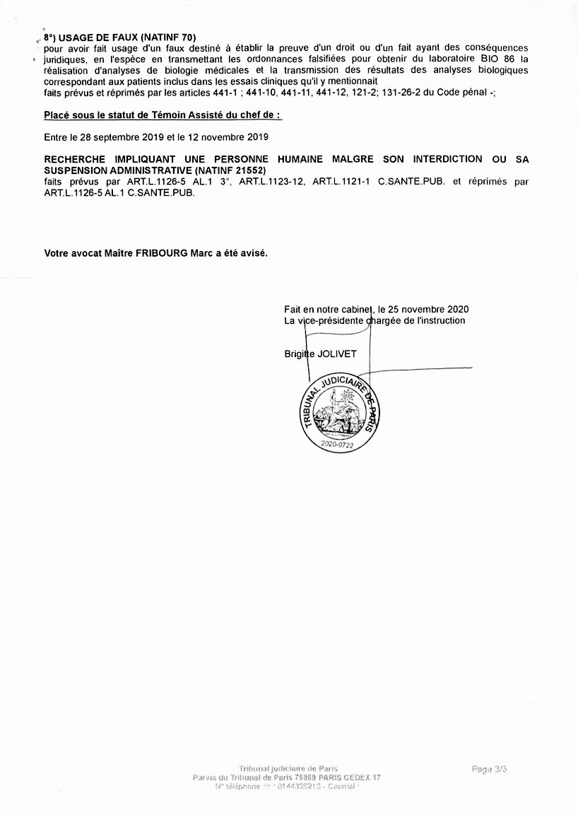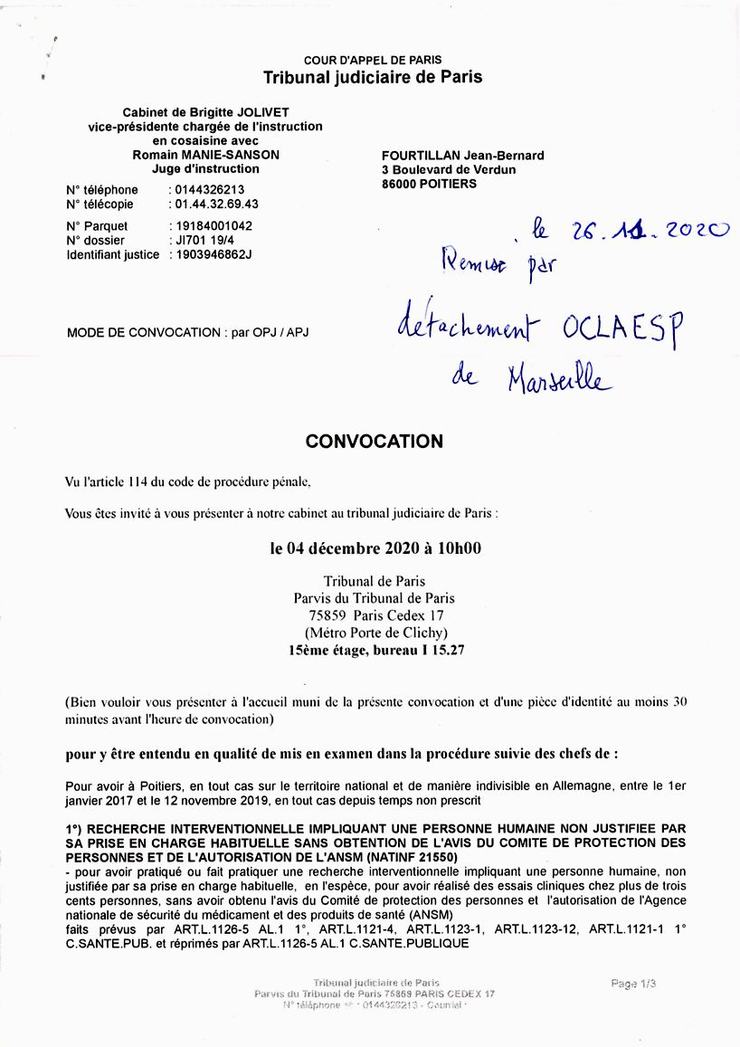 În graba lor de a-l neutraliza pe profesorul Jean-Bernard FOURTILLAN, l’Institut Pasteur, Președintele MACRON și complicii lor m-au convocat la Tribunalul Judiciar din Paris (Piesa 10) sub pretextul inculpării într-o procedură deja reglată la 11martie 2020, când am răspuns la toate întrebările, ceea ce mi-a permis să arăt că cele 8 acuzații ANSM (Agenția Națională de Securitate a Medicamentului), și ale doamnei Agnès BUZYN (ministereasă a Sănătății, la data de 19 septembre 2019), sunt lipsite de orice fundament.