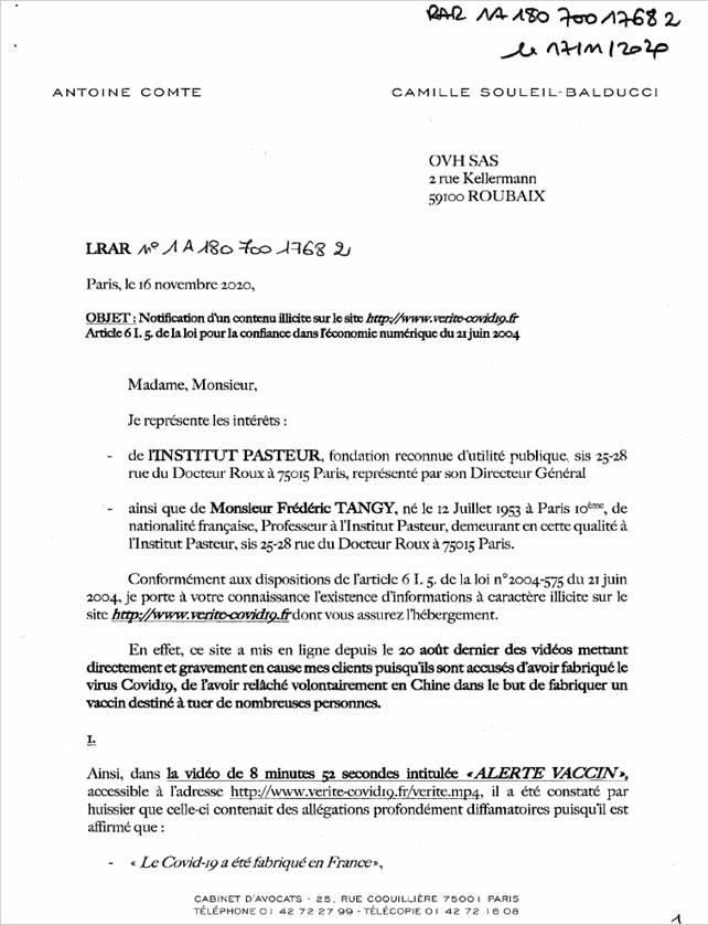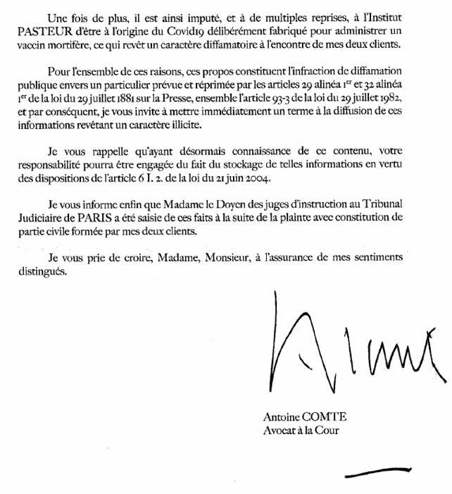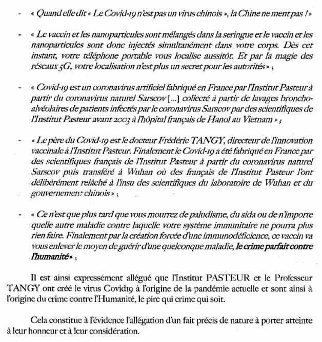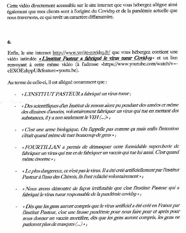 Odată în plus se afirmă astfel, repetat, că Institutul PASTEUR este la originea virusului Covid19 fabricat intenționat pentru a se putea face apoi un vaccin mortal, ceea ce prezintă un caracter difamatoriu pentru cei doi clienți ai mei.