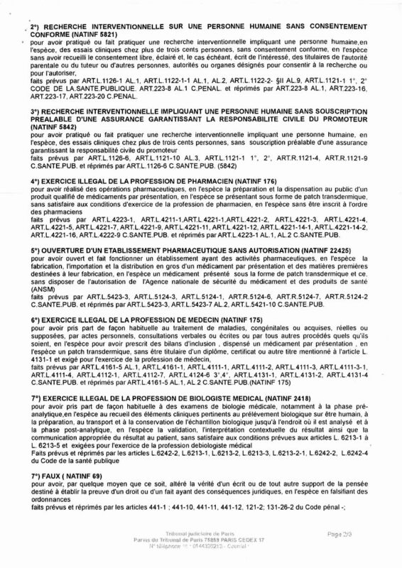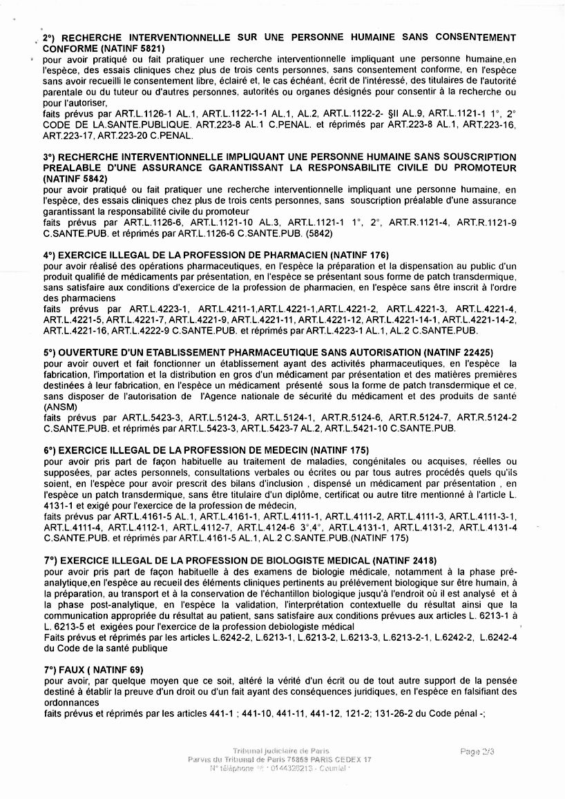 fapte prevăzute de articolele L. 1126-5. Al. 1, 3o, art. L. 1123-12, art. L. 1121-1, Cod Sănătate Publică și pedespsite de art. 1128-5, a. 1, Cod Sănătate Publică.