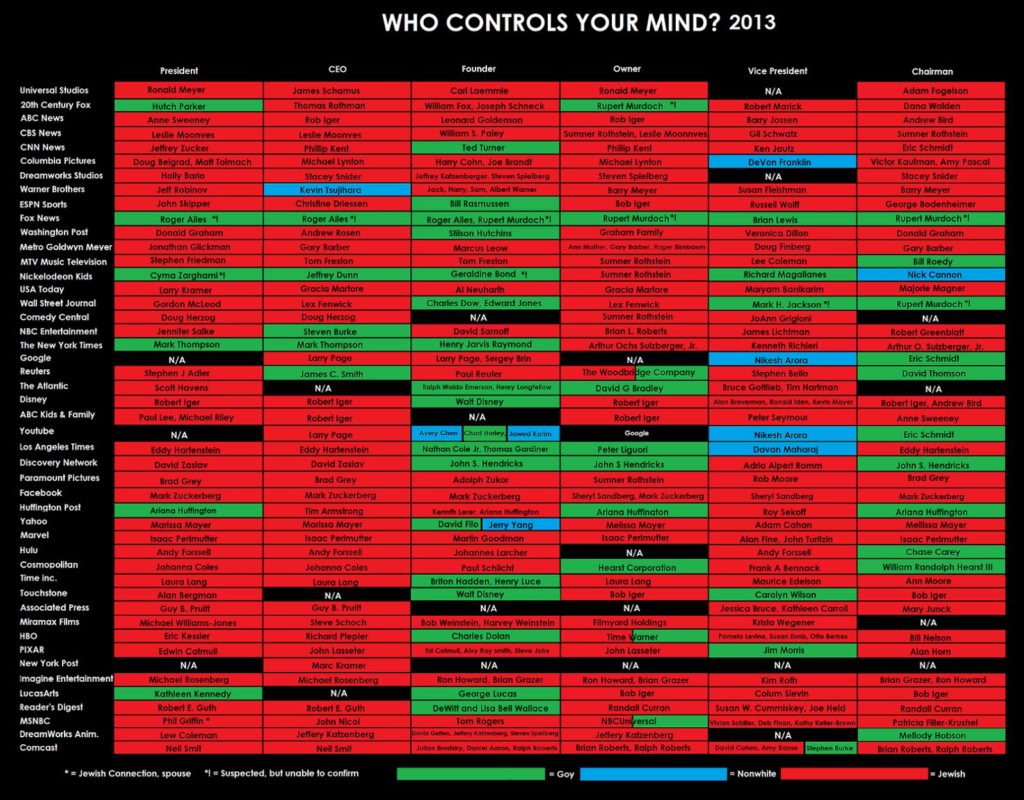 Însă dacă sapi mai adânc, dacă verifici pe Wikipedia de exemplu, cine se află în spatele acestor corporații, cine e în spatele mass media, cine e în spatele propagandei Hollywood – găsești mereu persoane de origine evreiască.
