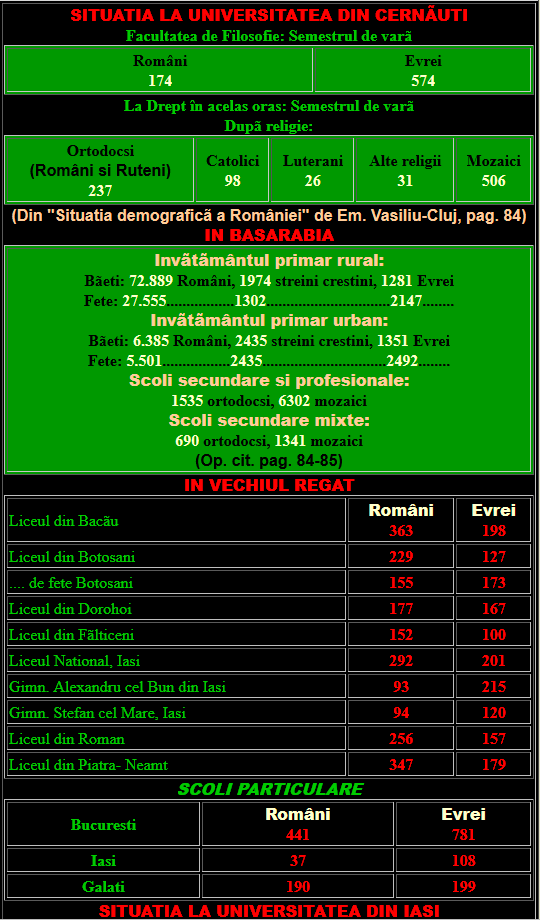 Mai grav, dintr-un pol al reacțiunii naționale școala urma să se bolșevizeze datorită afluxului de profesori (cripto)jidani iar viitorul învățământului și culturii era unul sumbru. Cele mai importante revendicări (nesoluționate) au fost: „numerus clausus”, adică împărțirea locurilor din universități proporțional cu ponderea pe țară a naționalităților și acordarea de burse pentru studenții din familii sărace.