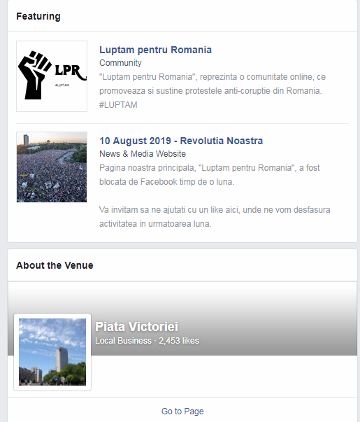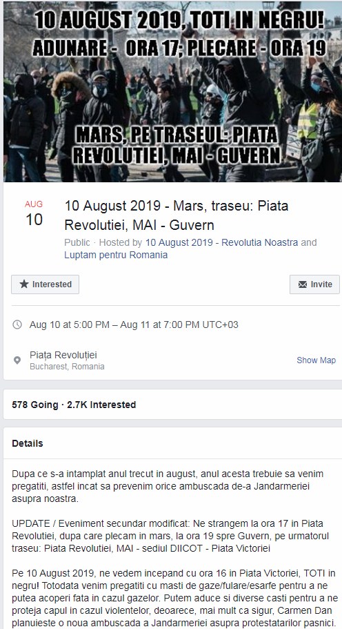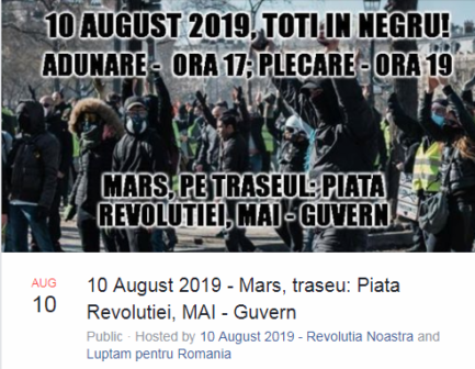 Altă pagină, “10 August 2019 – Revoluția Noastră”, încurajează participanții să se îmbrace în negru, folosind ca poză de copertă o imagine cu huligani ce poartă măști.