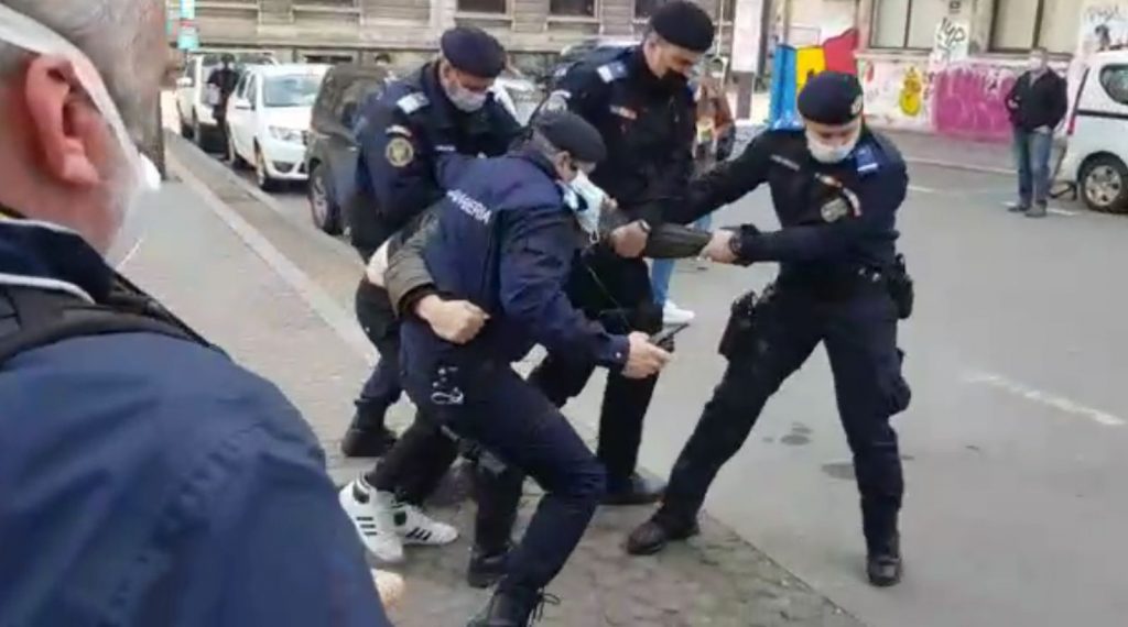 Un bărbat care protesta, luni, în Piaţa Universităţii a fost ridicat de jandarmi şi dus la secţia de Poliţie, deoarece a refuzat să poarte mască și să se legitimeze.