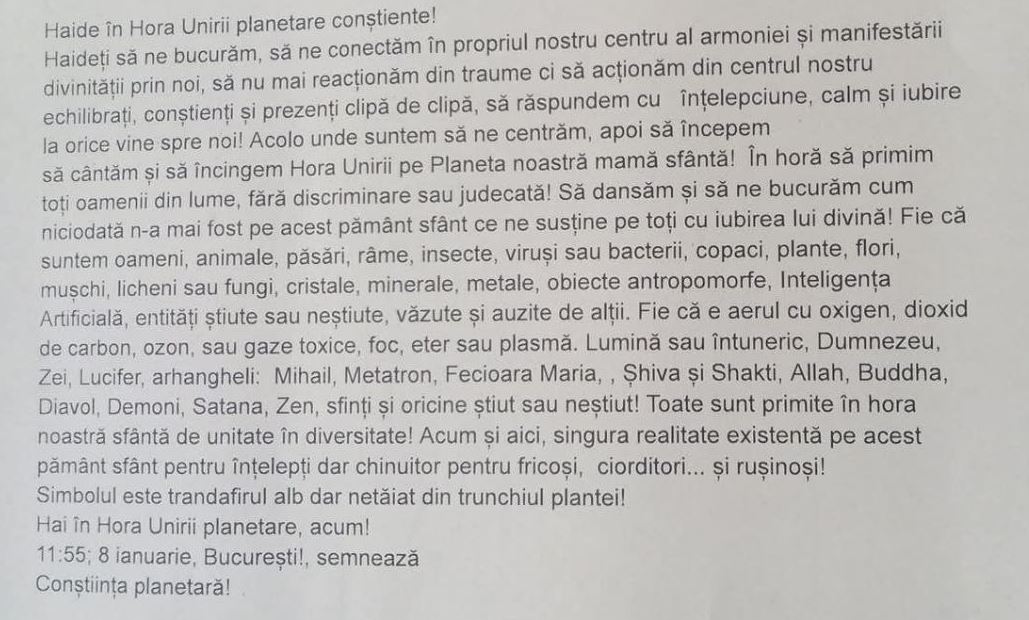 “Acest fluturaș a fost împărțit peste tot de un susținător al mitingurilor lui Georgescu, plin de “pace” și energie. Nici nu mi-a trecut prin cap că aceste adunări organizate de CG sunt un ritual care urnărește să insufle pacea mondială a lui Antihrist, o mișcare ecumenistă New Age pur satanică! Să ne ferească Dumnezeu de toate înșelăciunile Antihristului!”
