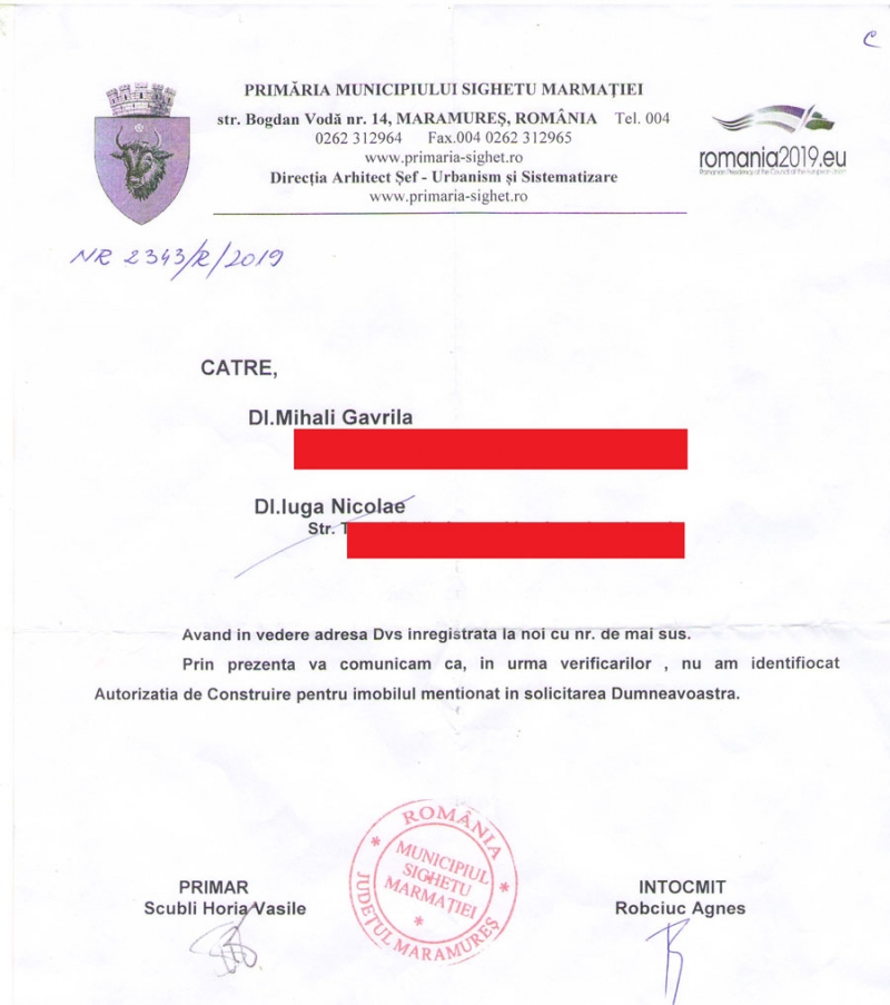 Documentul semnat de către primar vine ca răspuns oficial al arhitectului șef al municipiului, Bologa Ioana, la adresa cu nr. 2343 / 25.02.2019, depusă de către cei doi consilieri, prin care aceștia cereau să li se pună la dispoziție o copie după autorizația de construcție a lăcașului de cult, aflat în construcție pe strada Gheorghe Doja din Sighetu Marmației, cu destinație sinagogă (vezi mai jos facsimil nr. 1).
