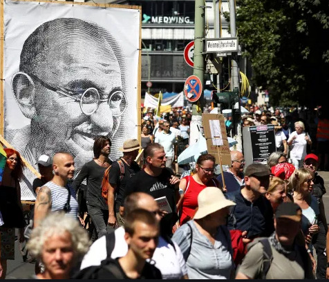 In final Merkel a trimis o alta politie, constituita EXCLUSIV !!! din alogeni – niciun bio-neamt care sa planga , nu mai era in randurile ei ! Astia l-au arestat brutalizandu-l pe Thorsten Schulte – desi masele purtau portretul lui Gandhi de dimensiune gigantica , cu ei ! In semn pasnic !