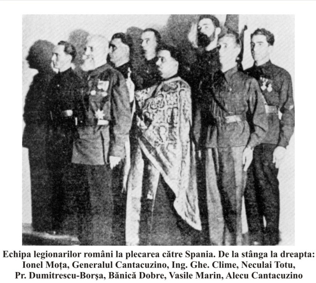 Ioan Moţa şi Vasile Marin au făcut parte din echipa compusă din şapte căpetenii legionare, în frunte cu generalul Gheorghe Cantacuzino-Grănicerul, înrolaţi ca voluntari în armata naţională a generalului Franco, în timpul războiului civil din Spania. Cei doi au căzut în zorii zilei de 13 ianuarie 1937, în timpul operaţiunilor militare de respingere a unui asalt al trupelor comuniste, stârnind în România o admiraţie deosebită în toate mediile sociale şi politice. Pesonalităţi ale vieţii politice, culturale şi ecleziastice au elogiat sacrificiul celor doi.  Trupurile lor au fost repatriate după o lună, funeraliile celor doi lideri legionari adunând în capitala ţării sute de mii de oameni.