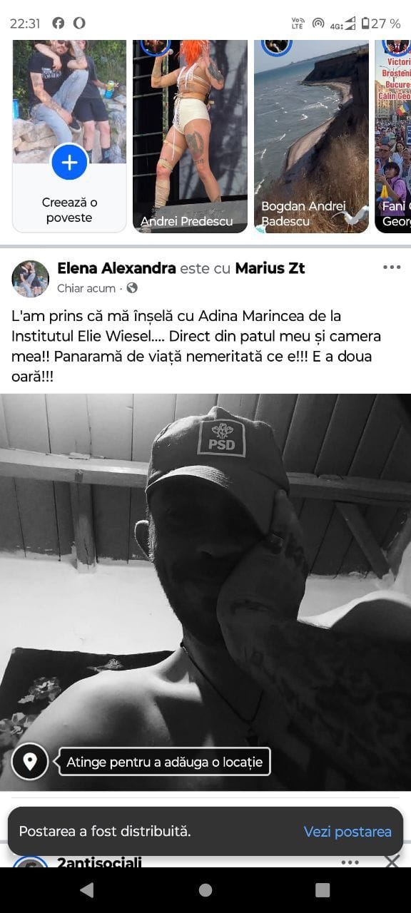 “L-am prins că mă înșelă (sic!) cu Adina Marincea de la Institutul Elie Wiesel….Direct din patul meu și camera mea! Panaramă de viață nemeritată ce e!!! E a doua oară!!!