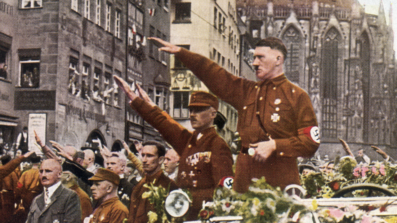 August 1927: Austrian born German fascist dictator, Adolf Hitler, saluting the massed ranks of his party during the party congress at Nuremberg. (Photo by Hulton Archive/Getty Images)