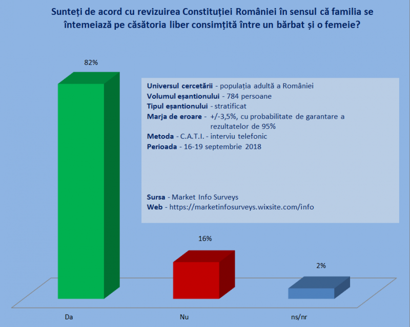 Un sondaj realizat de Market Info Surveys, în perioada 16-19 septembrie 2018, arată că 82% dintre românii cu drept de vot sunt de acord cu modificarea Constituţiei. 16% sunt împotrivă, iar 2% nu au o opinie clară pe subiect.