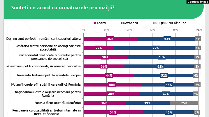 Naționalismul este văzut ca o mișcare necesară pentru România de aproape jumătate dintre români, neîncrederea în străinii acre critică România este confirmată de 50% dintre respondenți, iar Soros este un personaj real care a făcut rău României pentru 36% dintre români.