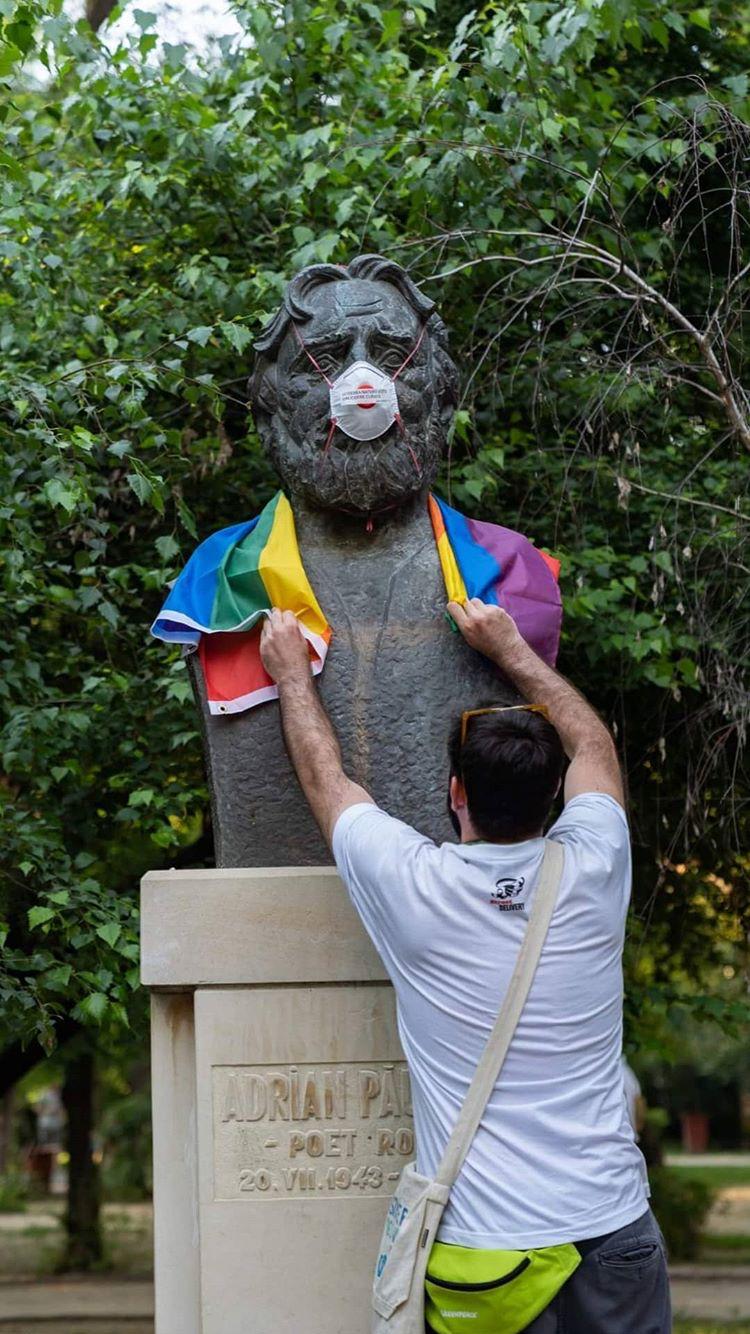 Statuia poetului Adrian Păunescu, situată în Grădina Icoanei din București, a fost „vandalizată” de către un susținător al comunității homosexualilor cu ocazia evenimentului „Street Delivery 2019” din Capitală, informează ActiveNews în exclusivitate.