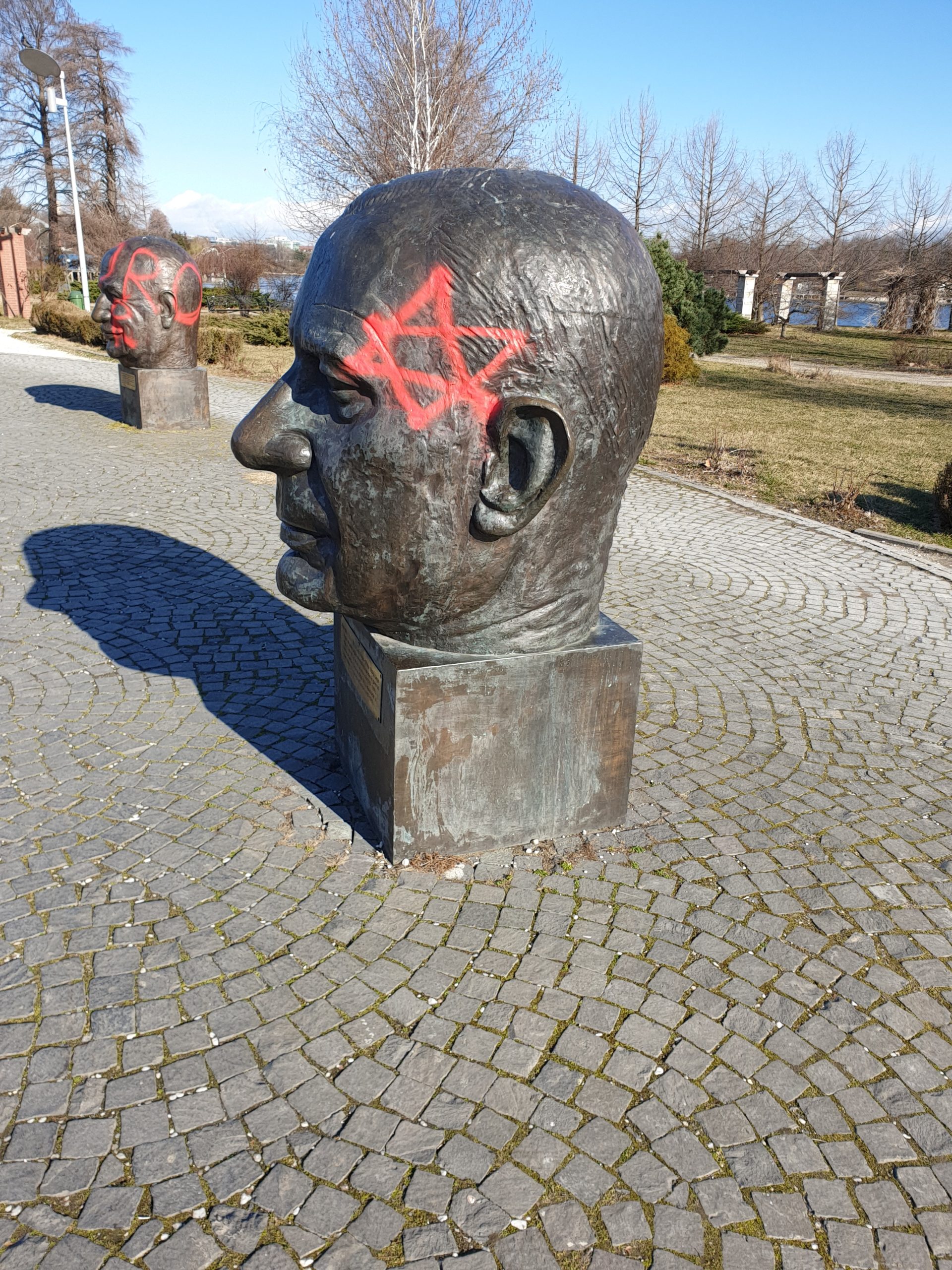 Știrea, care nu a fost prezentată de mass media, este că statuile fondatorilor UE din Parcul Herăstrău au fost MARCATE. Cu vopsea roșie s-a desenat un simbol satanic.