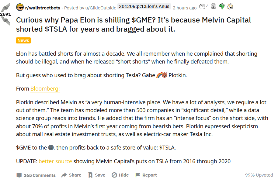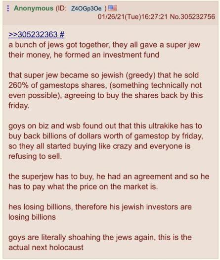 Nu au fost ajutați de faptul că și-au creat inamici. Prețul de azi a fost propulsat și de o postare pe Twitter a lui Elon Musk – a cărui companie, Tesla, a fost sub atacul scurtacilor de la Melvin Capital ani de zile. În locul lor m-aș bucura că nu a pus întrebarea importantă – “(((Cine))) crezi că deține hedge fundurile? Alo?”