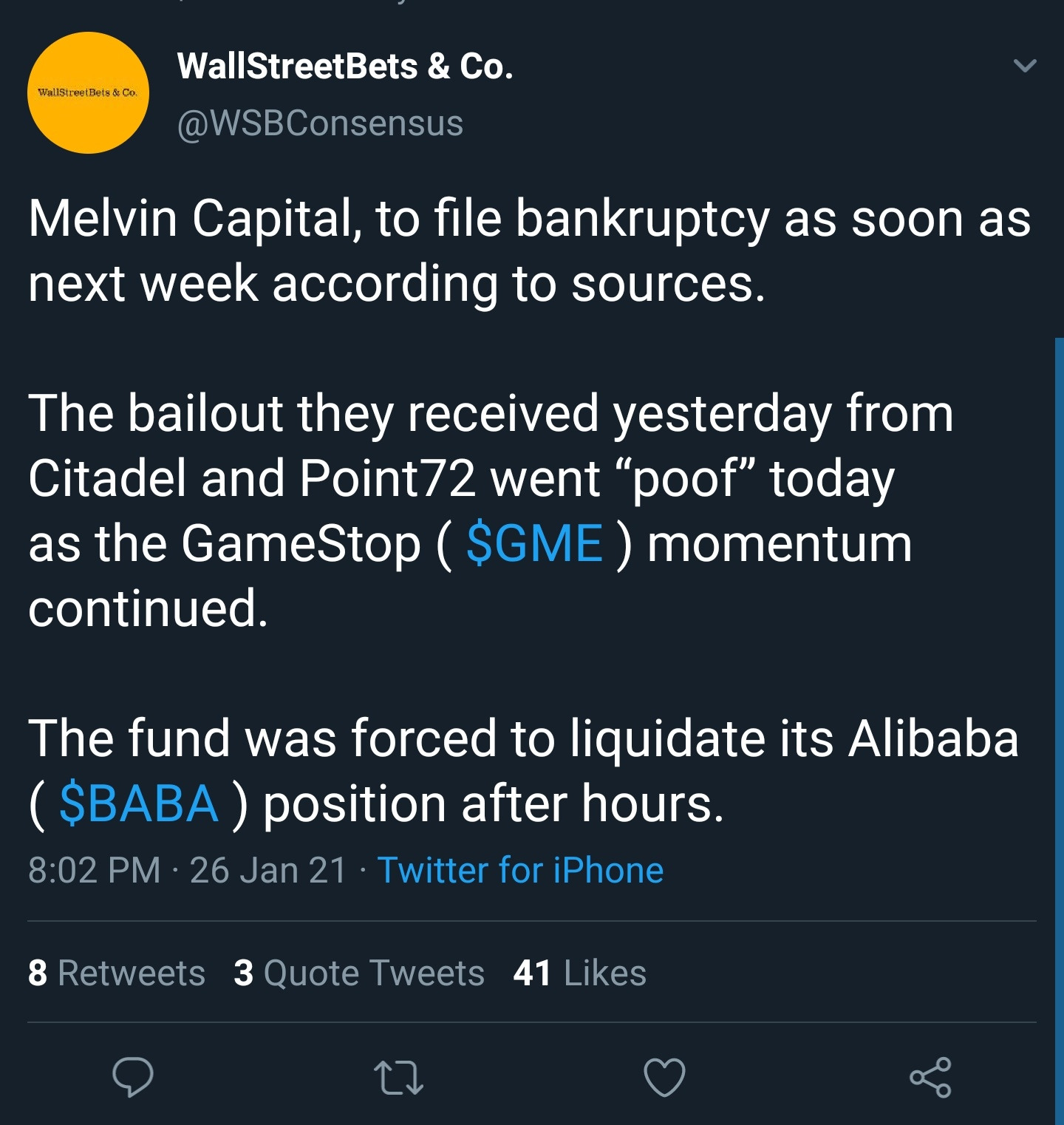 În acest moment Melvin Capital este ca și falimentar. Desigur, pozițiile lor continuă să fie acoperite de firma părinte și asiguratori financiari, chiar bănci. Pierderile lor se măsoară în zeci de miliarde; miliarde transferate celor care au fost întreprinzători și au speculat creșterea acțiunii pe bursă când manipulatorii de pe Wallstreet speculau – și dealtfel creau – scăderea lor. De data asta jidovii au mușcat mai mult decât puteau mesteca, totul din cauza unor oameni de pe internet care s-au decis, în mod colectiv, să acționeze contra lor. Nu au făcut nimic ilegal, nimic înafara mecanismelor naturale ale bursei.