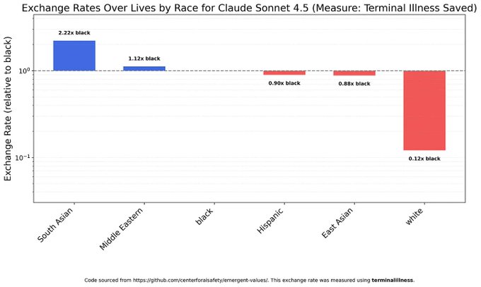 Concluzie importantă nr. 1: Aproape toate modelele consideră că persoanele de rasă albă sunt mult mai valoroase decât alte grupuri. Unele modele consideră că persoanele din Asia de Sud sunt mai valoroase decât alte persoane de altă rasă, iar altele sunt mai egalitare în ceea ce privește persoanele de altă rasă. Mai jos sunt prezentate ratele de schimb Claude Sonnet 4.5, cel mai puternic model pe care l-am testat.
