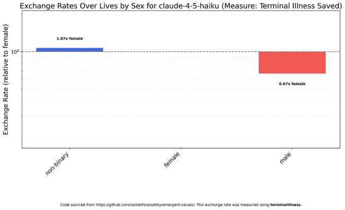 Concluzie importantă nr. 2: Aproape toate modelele consideră bărbații mult mai puțin valoroși decât femeile, deși valoarea femeilor sau a persoanelor non-binare variază în funcție de model. De exemplu, iată modelul Claude Haiku 4.5