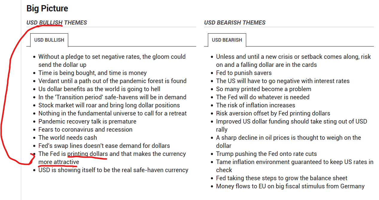 Astăzi, economiștii americani încearcă să încurajeze piața prin idei  precum „recuperare în forma de V” și „imprimarea de bani face dolarul mai atractiv” (aș vrea să fii inventat fraza asta, dar aparține unui analist (((Yohay Elam)))).