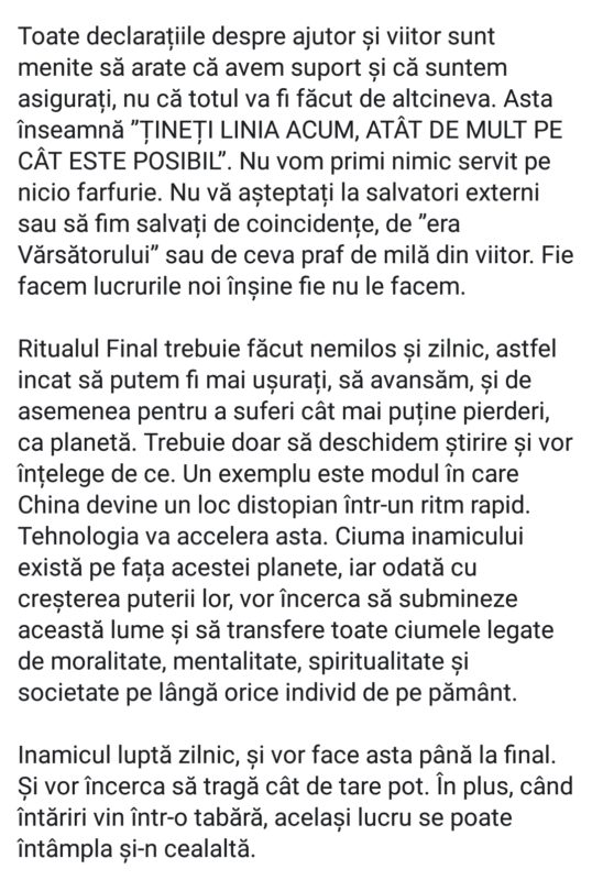 Știu că pare începutul unei campanii D&D, dar oamenii o iau în serios. Autism demn de spitalul 9.” — Pare deplasat cand judeci prin ochii lumii de acum. Insa majoritatea religiilor si cailor spirituale vorbesc de o lupta finala intre zei in urma careia Pamantul/Lumea va fi devastata/distrusa (Apocalipsa), iar la finalul acestei lupte zeul uneia din tabere va veni pe Pamanat (Isus la crestini, Kalki la hindusi, Vindex la noi), urmand ca “cei drepti” sa primeasca drept rasplata viata vesnica / nemurirea. Dincolo de aceasta parabola stau procese psihice si principii alchimice/filozofice. Cine are ochi de vazut va citi printre randuri si va intelege.