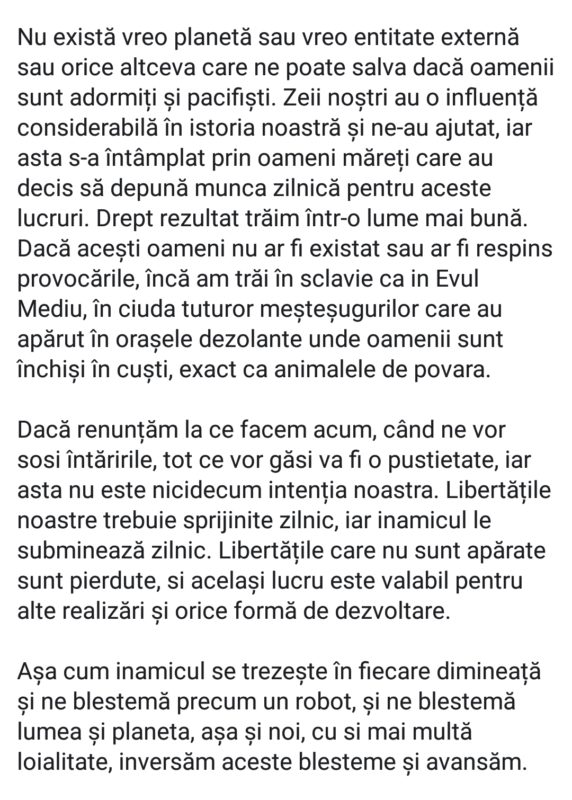 Pentru noi crestinismul ortodox este doar o inconventienta minora pe care nu ne irosim eforturile pentru a o submina in vreun fel sau altul. Masele neghioabe vor avea mereu nevoie de o religie care sa le linisteasca pulsiunile. Ramaneti cu bisericile si catedralele voastre – nu avem nevoie de tronurile voastre putrede. Ne gasim bucuria sufleteasca in varf de munte, in pesteri si paduri. In pustiu.