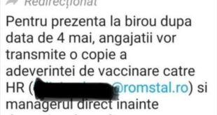 Condiționarea continuă! ROMSTAL cere angajaților adeverință de vaccinare April 26, 2021 Actualitate, Știrea zilei 12 Sterie Ciumetti | Încă un pas spre dictatură totală. Read More »